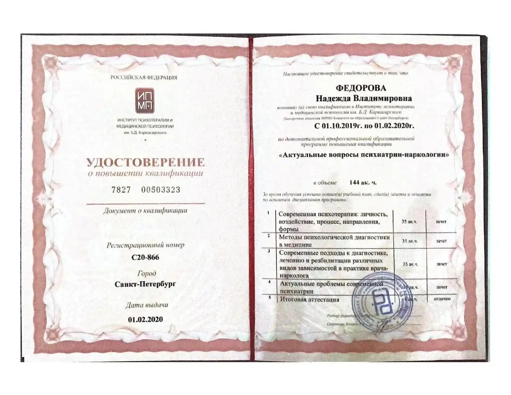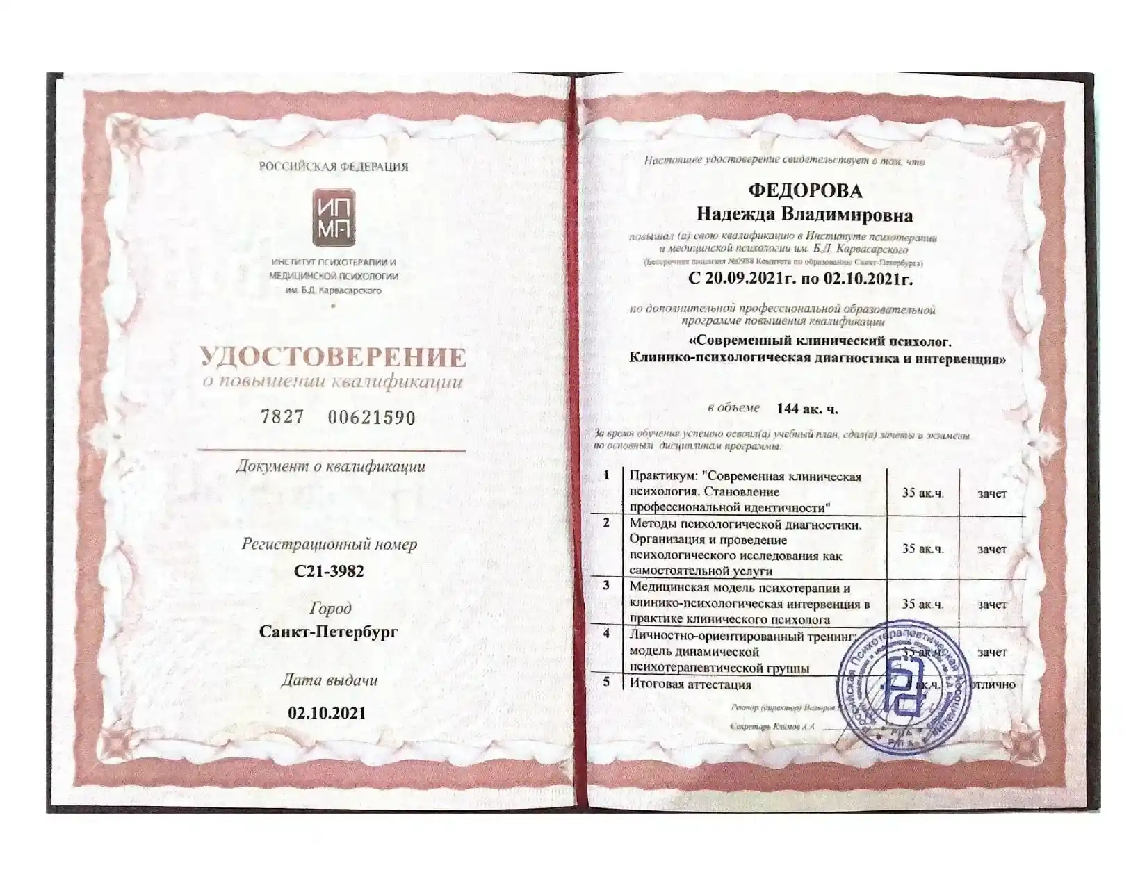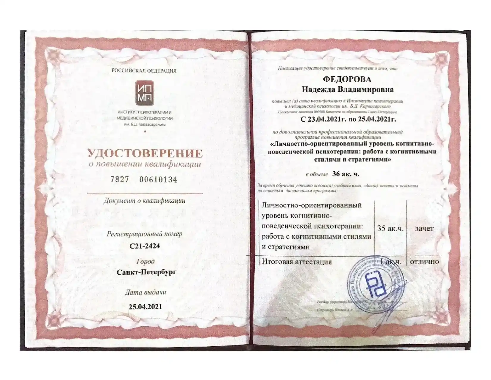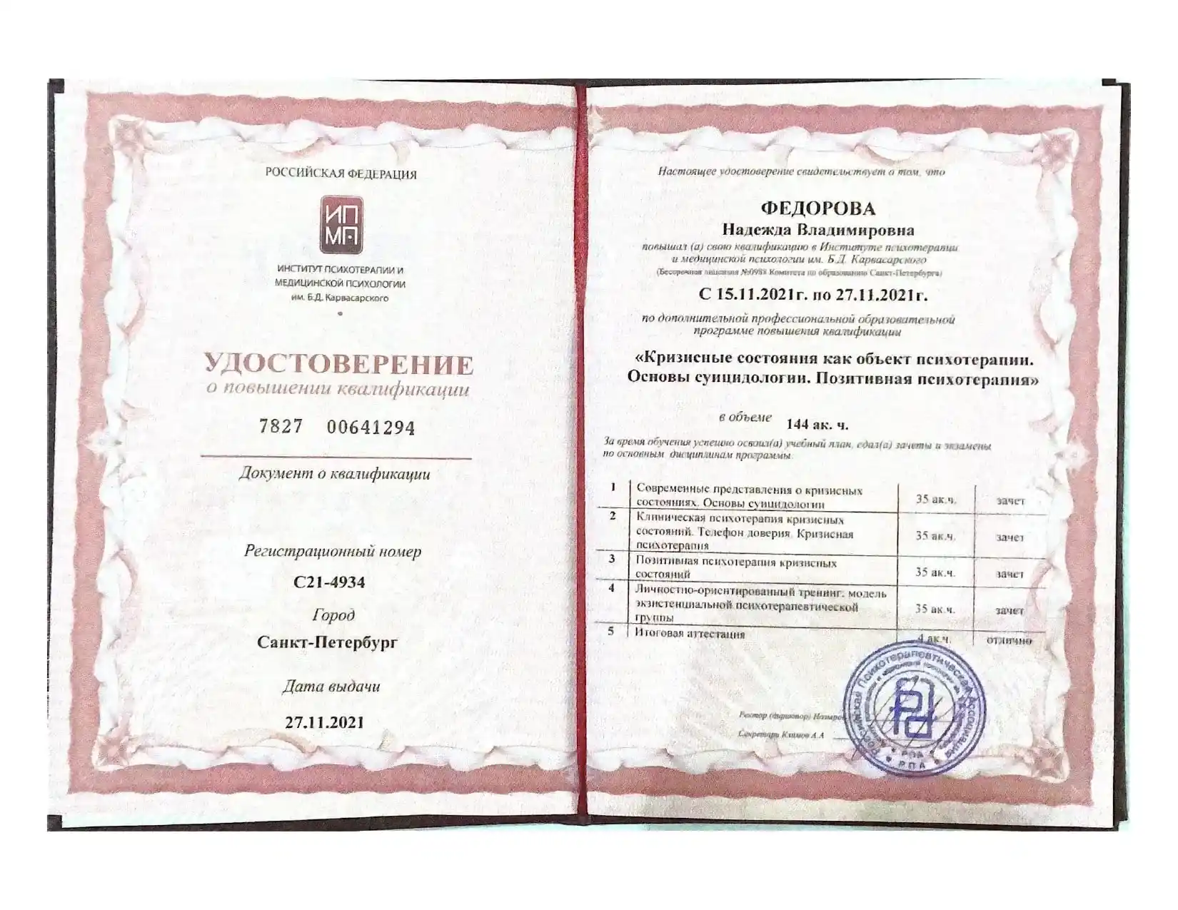 - Институт психотерапии и медицинской психологии РПА им. Б.Д. Карвасарского г. Санкт-Петербург.