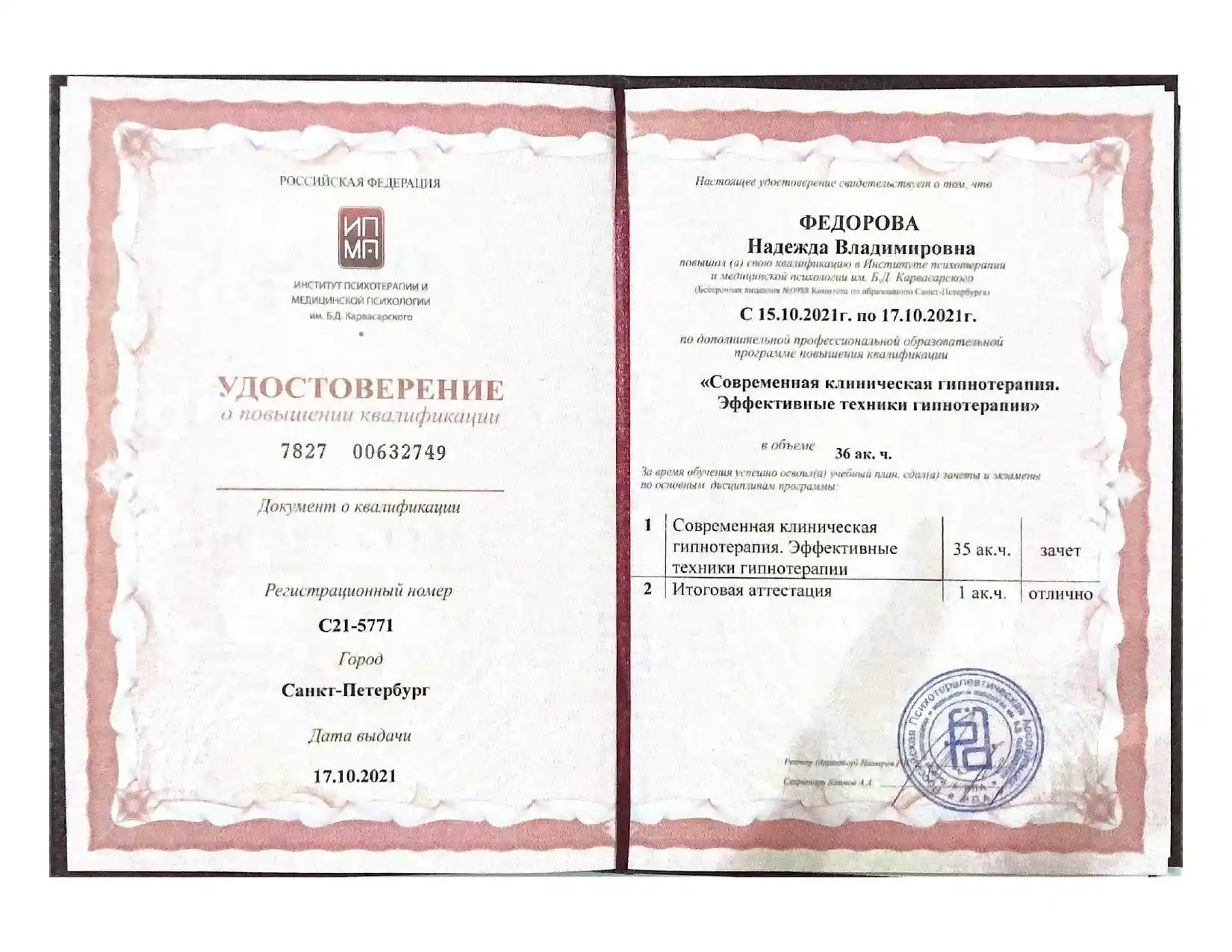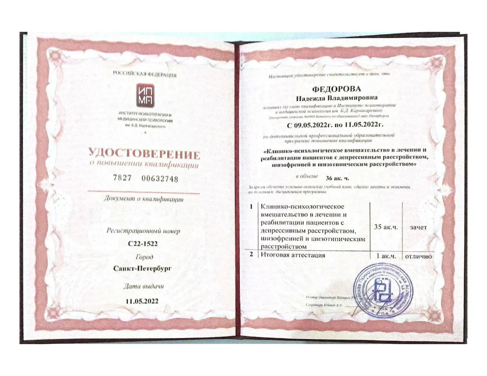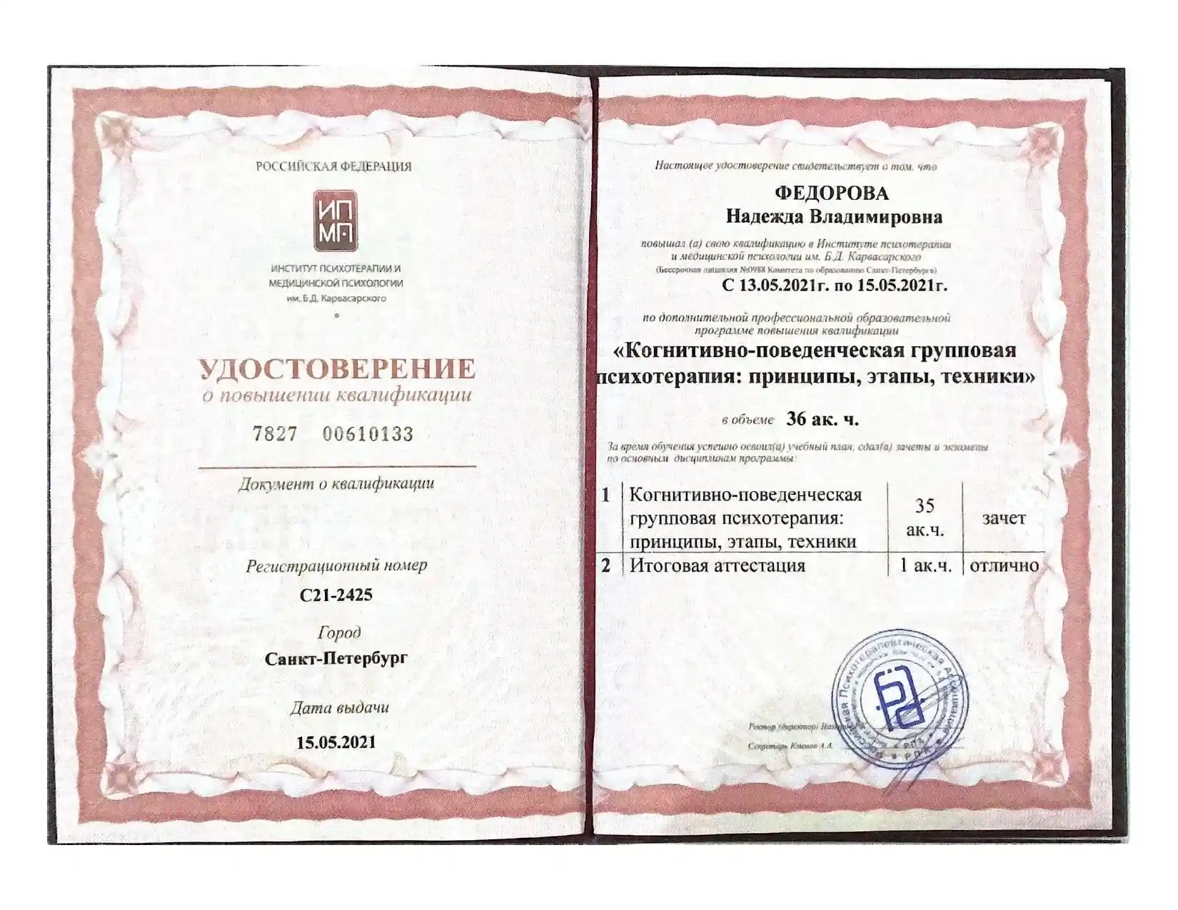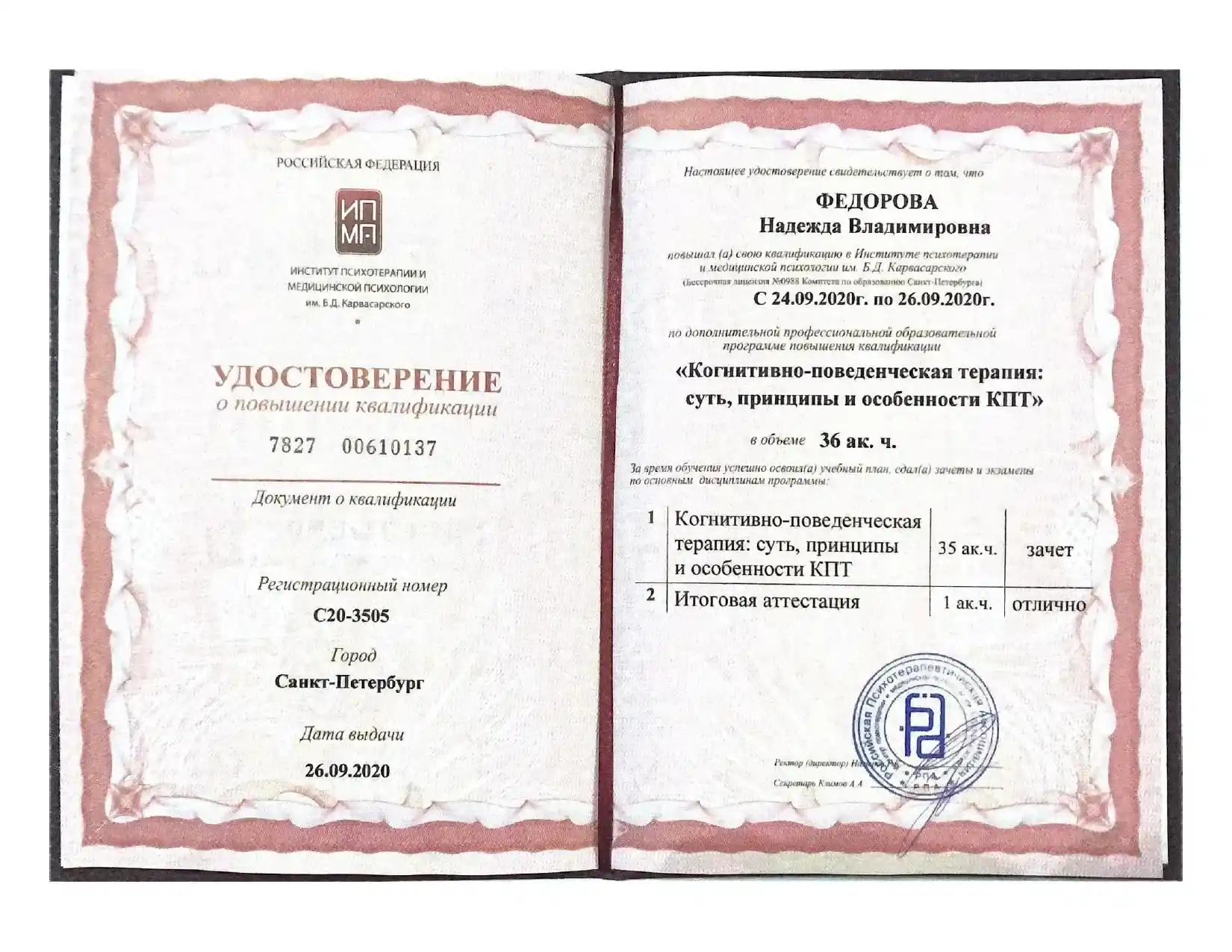 - Институт психотерапии и медицинской психологии РПА им. Б.Д. Карвасарского г. Санкт-Петербург.