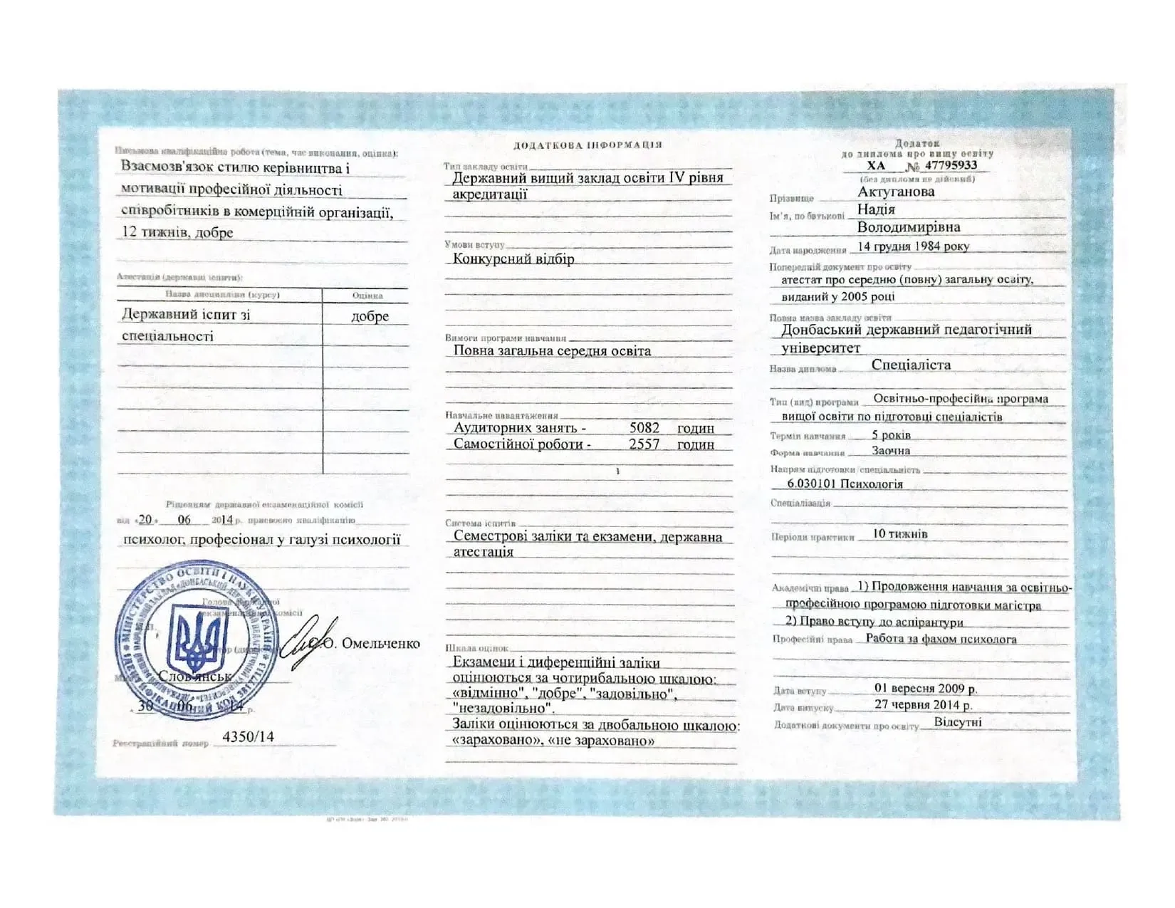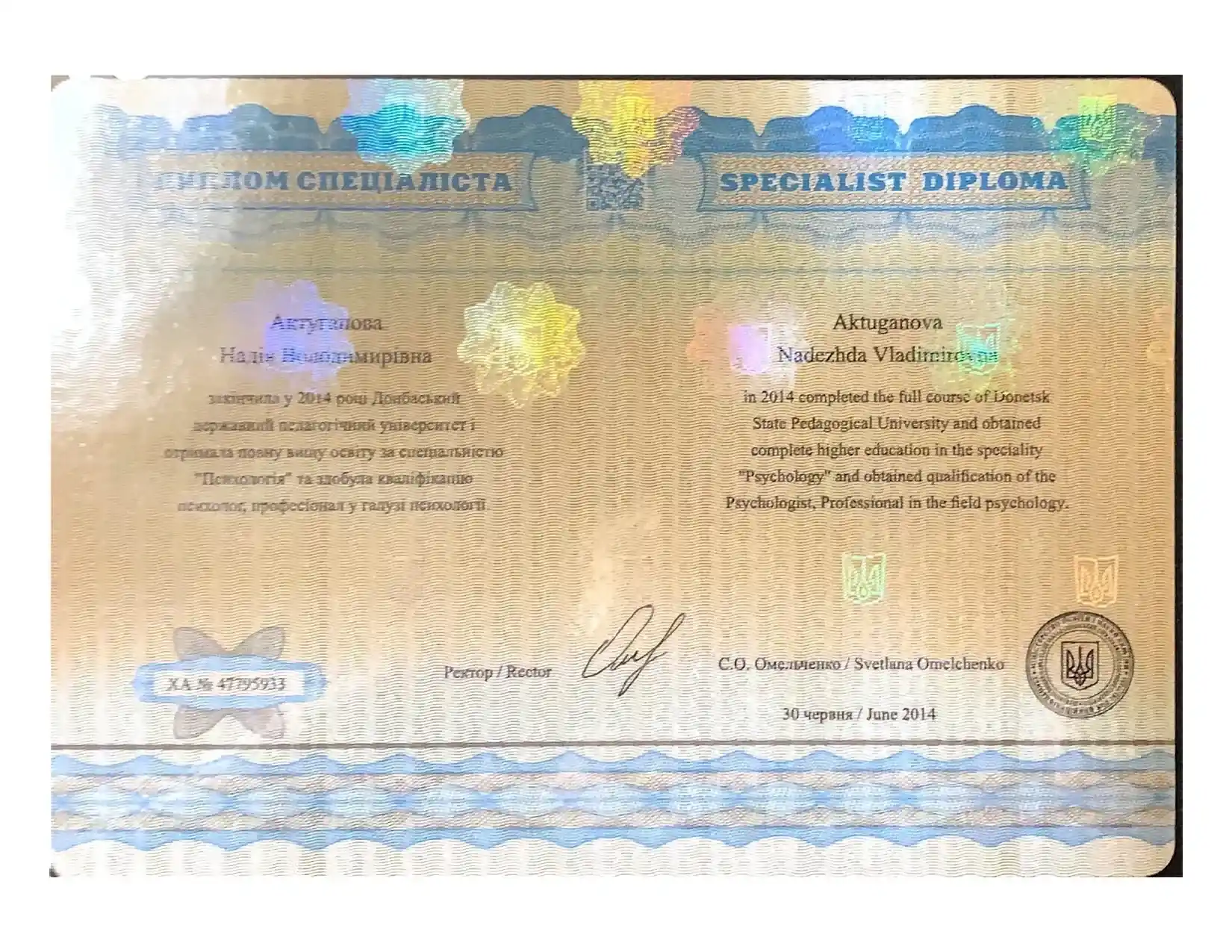 - В 2014 году получила диплом по Личностно-ориентированному уровню когнитивно-поведенческой психотерапии. Работа с когнитивными стилями и стратегиями.